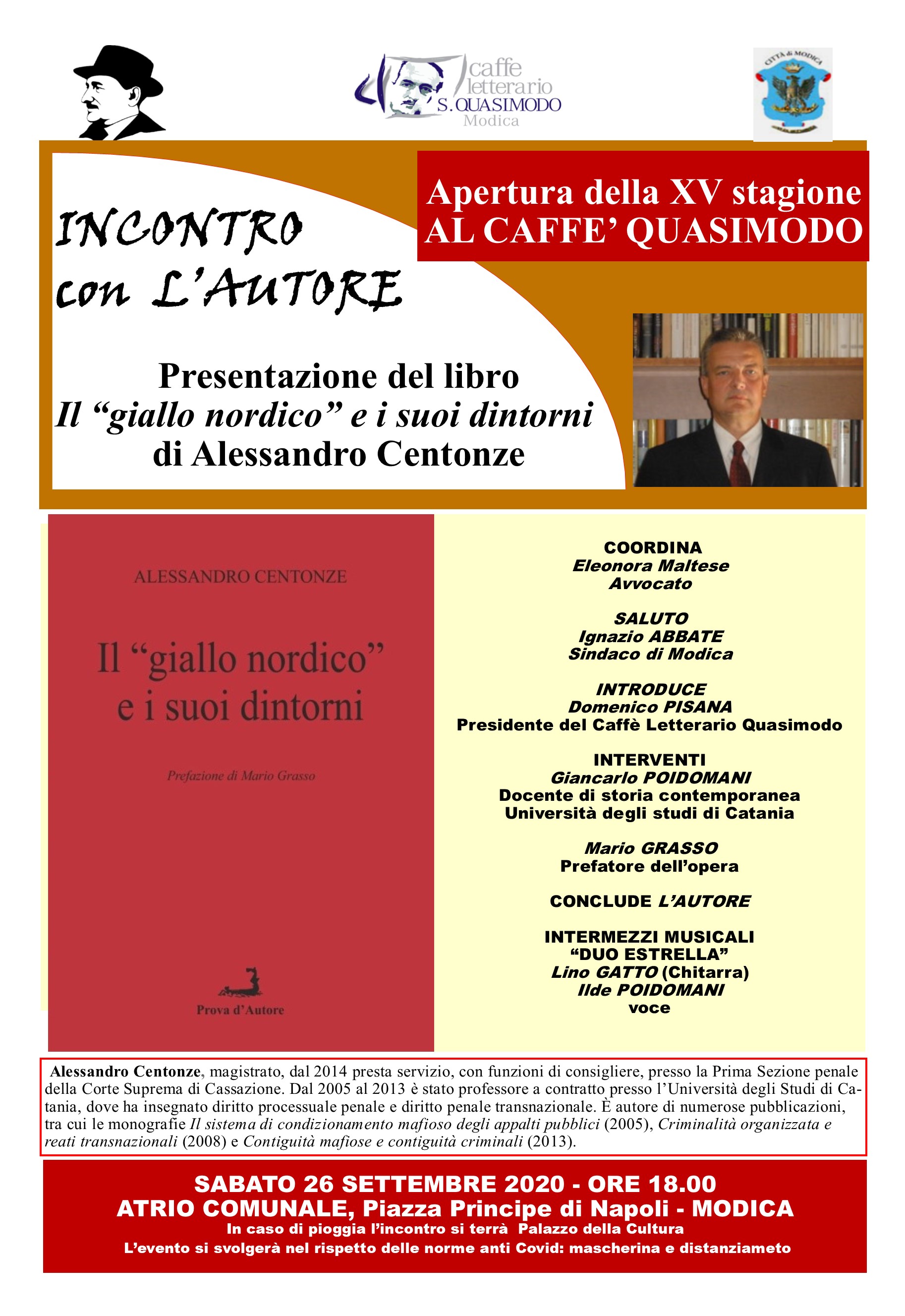 Il primo appuntamento, che vedrà il saluto del sindaco di Modica, Ignazio Abbate, sarà dedicato alla presentazione del libro dello scrittore e saggista Alessandro Centonze, magistrato, dal titolo Il “giallo nordico” e i suoi dintorni. Si terrà, alle ore 18.00, nell’Atrio comunale di Modica e sarà coordinato dall’avvocato Eleonora Maltese. In caso di condizioni metereologiche negative, l’incontro si svolgerà al Palazzo della Cultura.