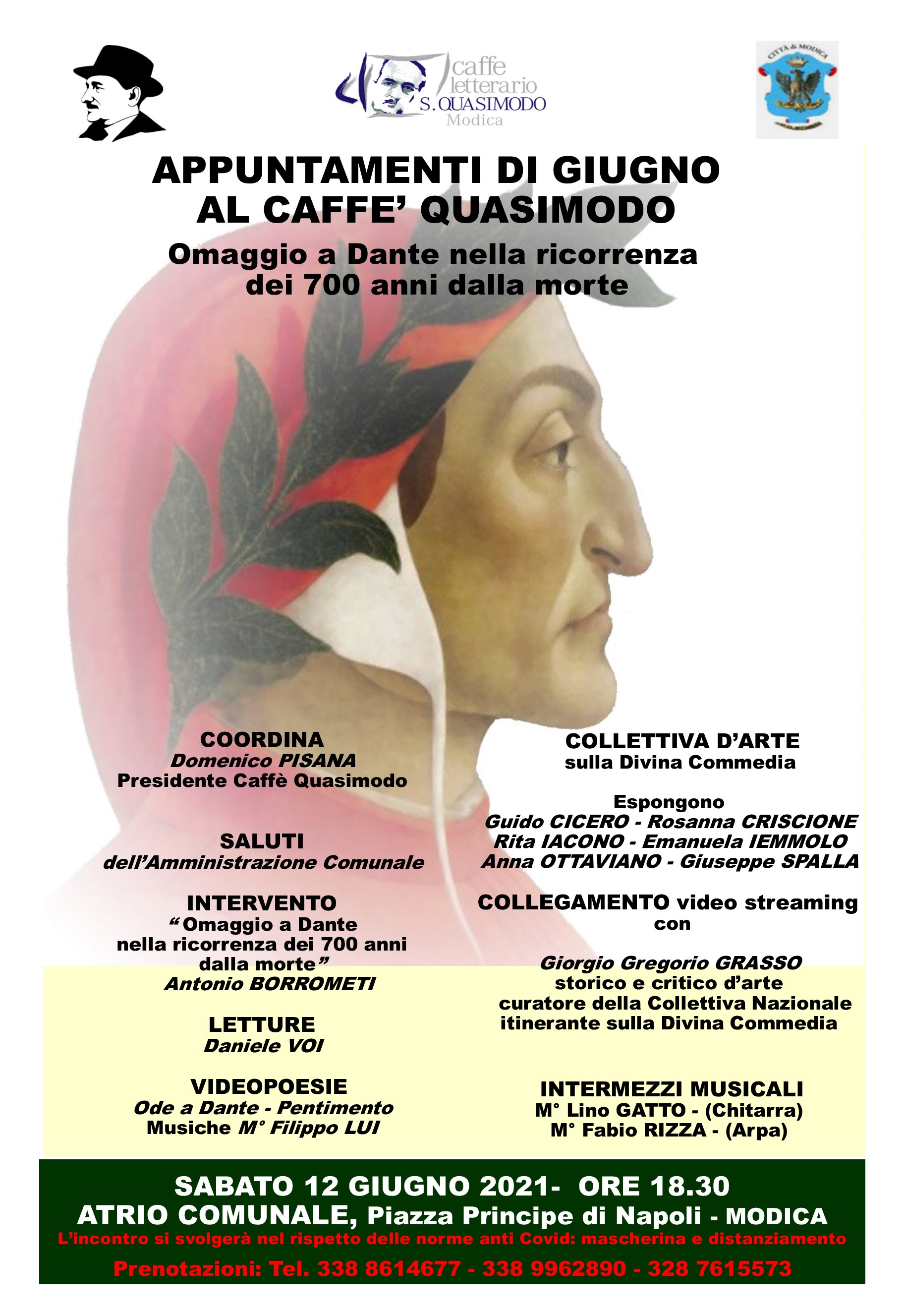 Modica, 8 giugno 2021 — Secondo “sabato letterario” di giugno al Caffè Quasimodo di Modica. È in programma sabato 12 alle ore 18.30, l’appuntamento dedicato a Dante nella ricorrenza dei 700 anni dalla morte, che si terrà nell’ Atrio Comunale come annunciato in questo link.