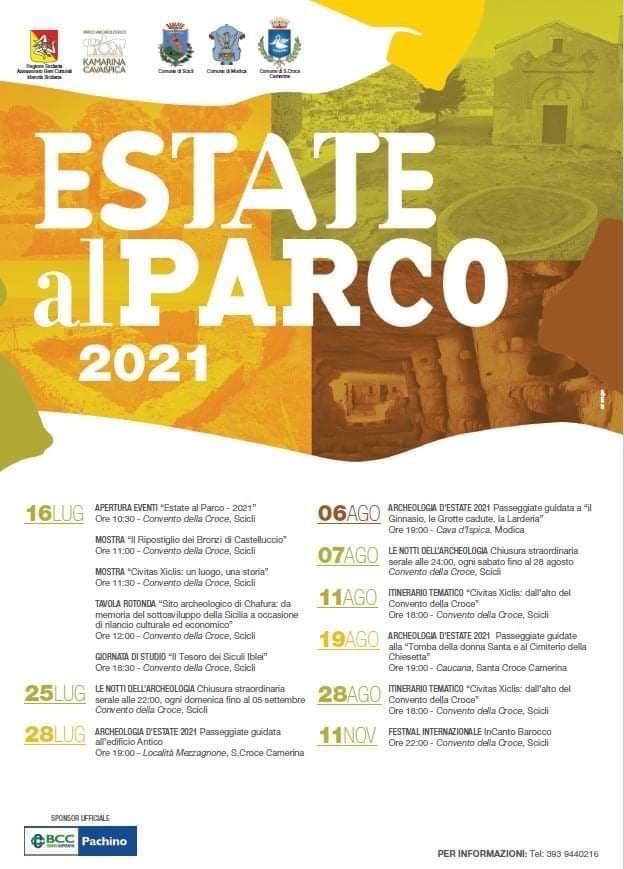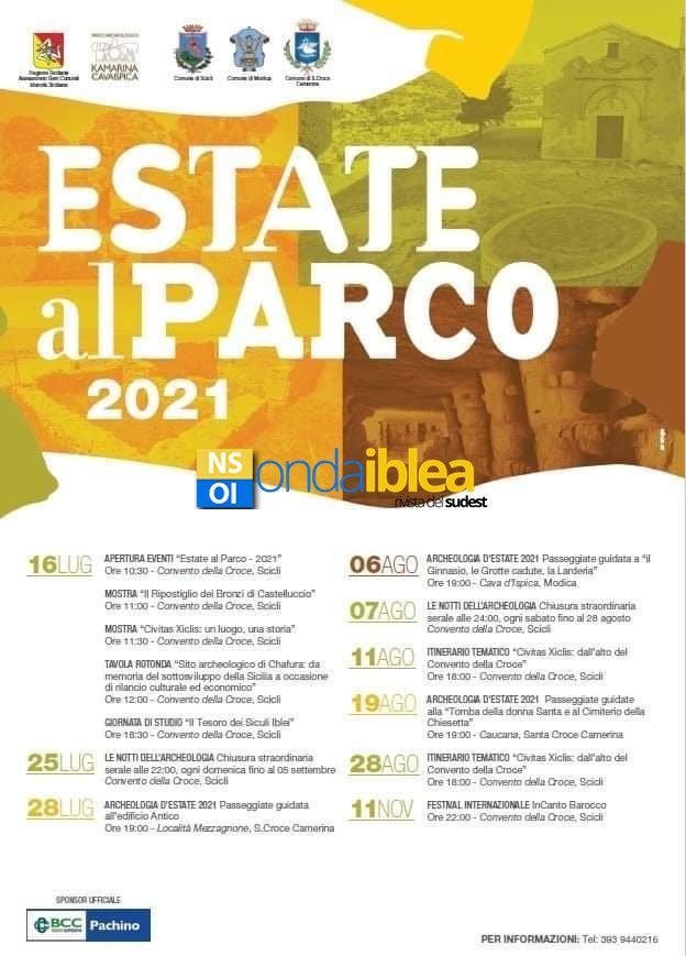 Un cartellone che miscela mostre, spettacoli, passeggiate guidate ed itinerari tematici; che coniuga linguaggi e promuove nuove realtà locali. Il Parco Archeologico di Kamarina e Cava d’Ispica dal 16 Luglio inaugura la stagione estiva 2021 con l’allestimento della mostra “Il Tesoro dei Siculi Iblei. Il Ripostiglio di Castelluccio” al Convento della Croce in Scicli, prolungando anche l’orario di visita del Sito, alle ore 22, ogni domenica dal 25 Luglio, fino al 5 Settembre ed alle 24, ogni sabato dal 7 Agosto, fino al 28 Agosto.