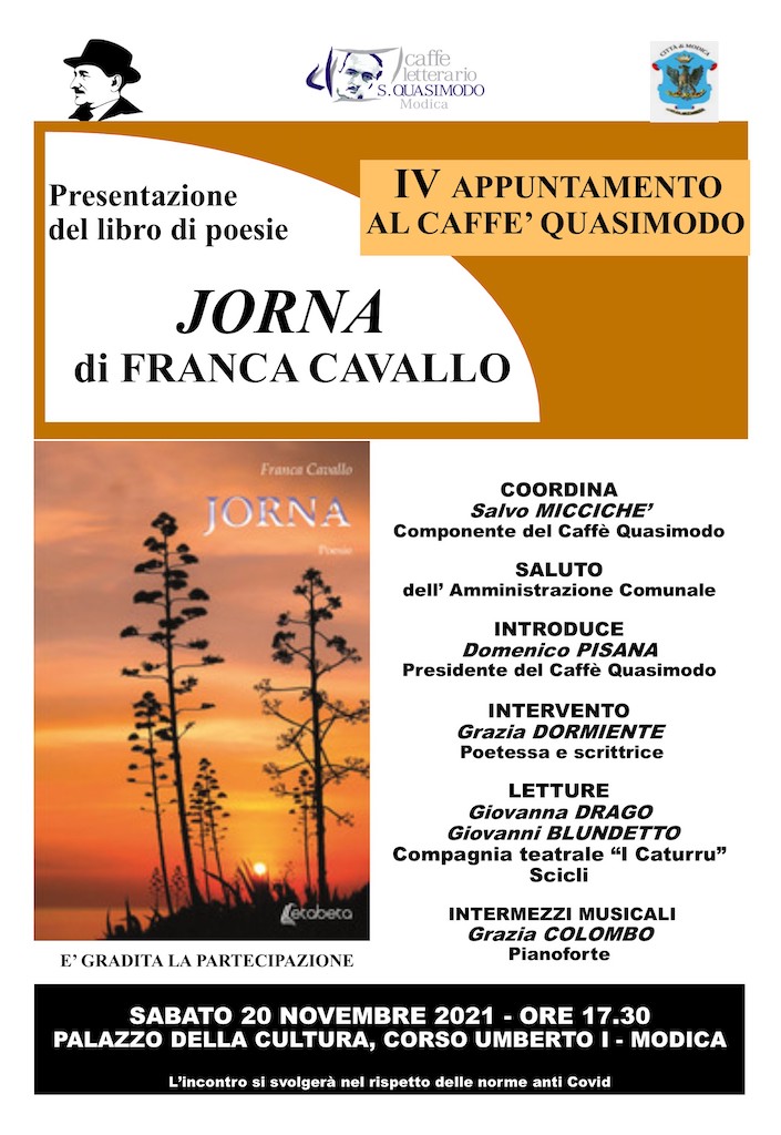 Modica, 13 novembre 2021 — “Jorna” è il titolo della raccolta di poesie dialettali di Franca Cavallo, che sarà presentato nel IV “sabato letterario” del Caffè Letterario Quasimodo di Modica, che si terrà alle ore 17.30 nell’Auditorium del Palazzo della Cultura il 20 novembre 2021, nel quadro della Stagione culturale 2021-22 del circolo culturale modicano.