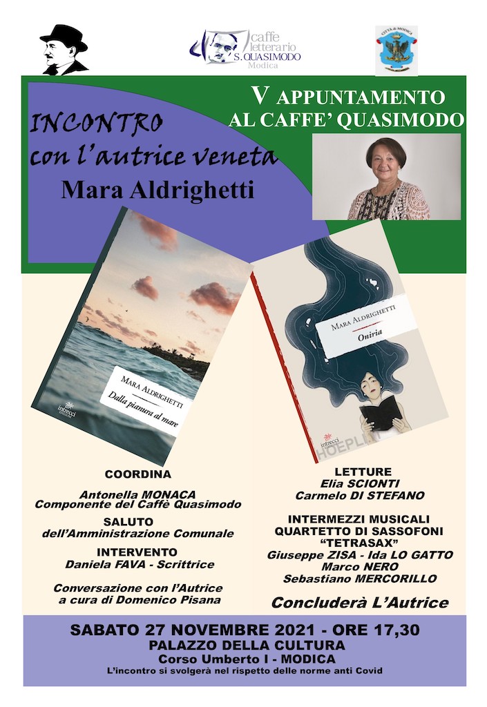 Modica, 22 novembre 2021 — Sarà dedicato alla narrativa della scrittrice veronese Mara Aldrighetti il V sabato letterario del Caffè Quasimodo di Modica, che si terrà il 27 novembre, alle ore 17.30, nell’Auditorium del Palazzo della Cultura, nel quadro della Stagione culturale 2021-22 del circolo culturale modicano.