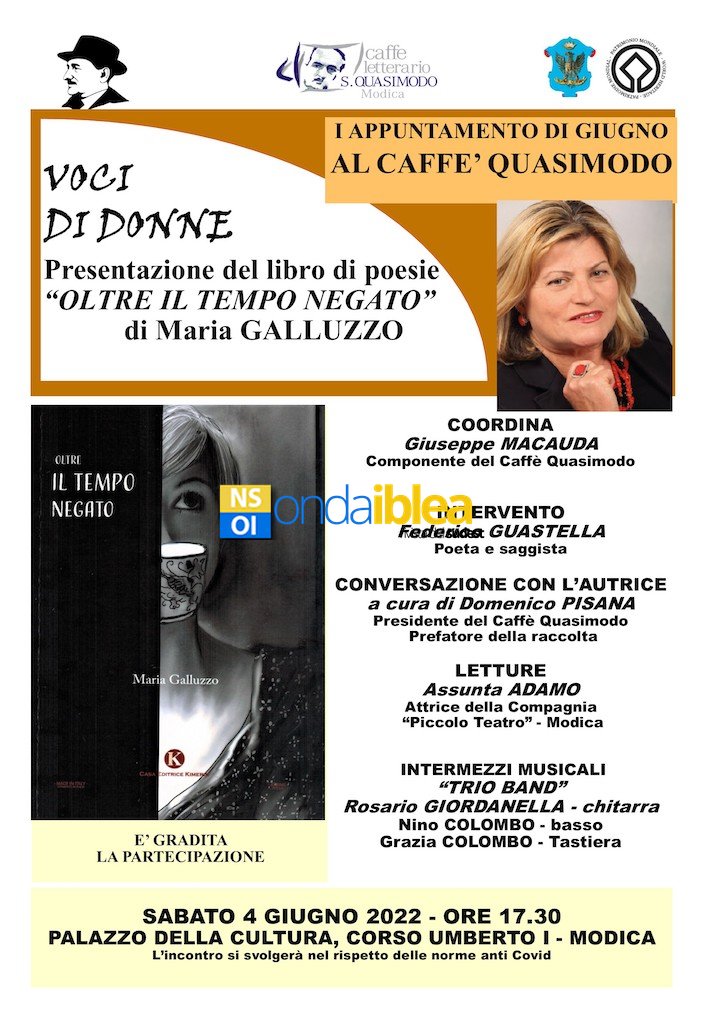 Modica, 30 maggio 2022 — Sarà dedicato alla poetessa Maria Galluzzo, docente di Lingua e Letteratura francese, originaria della Calabria ma residente a Scicli, il primo appuntamento di giugno del Caffè Letterario Quasimodo di Modica, che si terrà sabato 4 giugno, alle ore 17.30, al Palazzo della Cultura nell’ambito della 16ª stagione culturale 2021-2022.