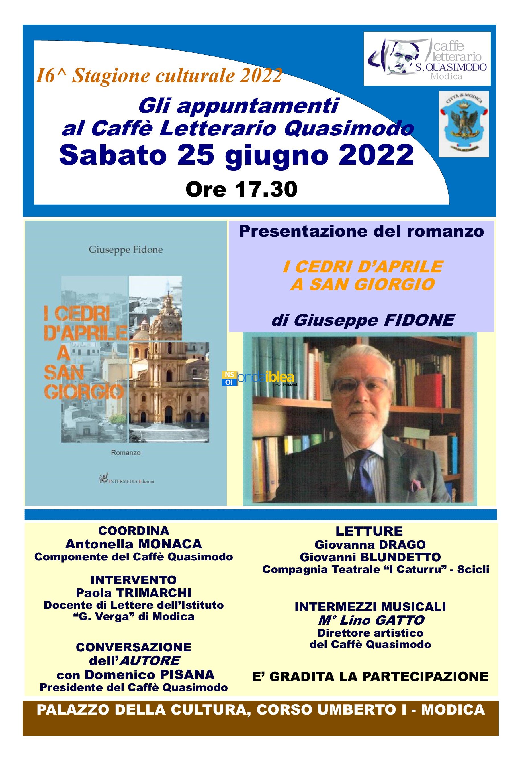 Modica, 20 giugno 2022 — Si chiude sabato prossimo la XVI stagione culturale del Caffè Quasimodo di Modica. L’appuntamento finale si terrà il 25 giugno alle ore 17.30 al Palazzo della cultura e sarà dedicato alla presentazione del romanzo I cedri d’aprile a San Giorgio.