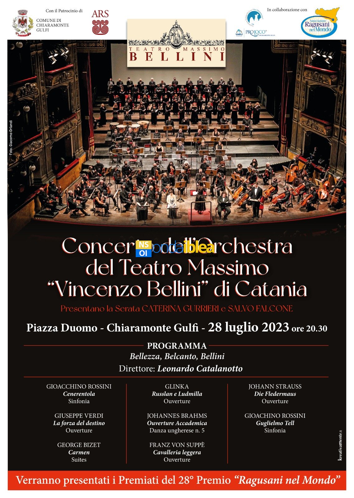 Ragusa, 12 luglio 2023 — Voluto dal sindaco di Chiaramonte Gulfi, Mario Cutello, e dall’Associazione Ragusani nel Mondo, nell’ambito degli eventi celebrativi della 28 edizione del Premio Ragusani nel Mondo, in collaborazione con la locale Pro Loco, diretta da Lucio Molè, e con gli auspici del Sovrintendente dell’ente Lirico catanese Giovanni Cultrera, ritorna dopo oltre 40 in Piazza Duomo a Chiaramonte l’Orchestra del Teatro Massimo Vincenzo Bellini.