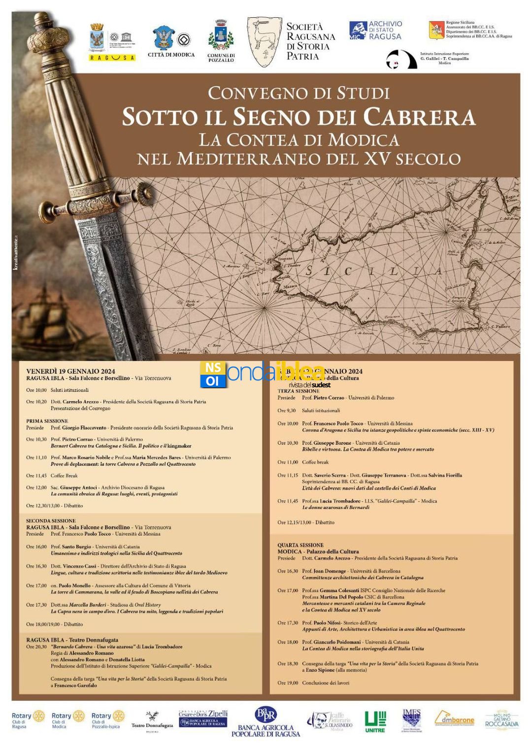 Si svolgerà a Ragusa e Modica, il 19 e 20 gennaio 2024 il convegno di studi “Sotto il Segno dei Cabrera — La Contea di Modica nel Mediterraneo del XV secolo”, a cura della Società Ragusana di Storia Patria.