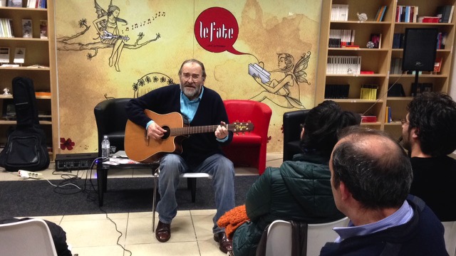 Ragusa, 16 dicembre 2014 – La presentazione di un libro diventa un mini concerto-spettacolo, e non poteva che essere così con Paolo Pietrangeli, cantautore e regista, ieri sera al caffè letterario Le Fate di Ragusa per la presentazione della sua prima fatica letteraria, il libro “Una spremuta di vite” edito da Navarra Editore con la prefazione del giornalista Gianni Mura.