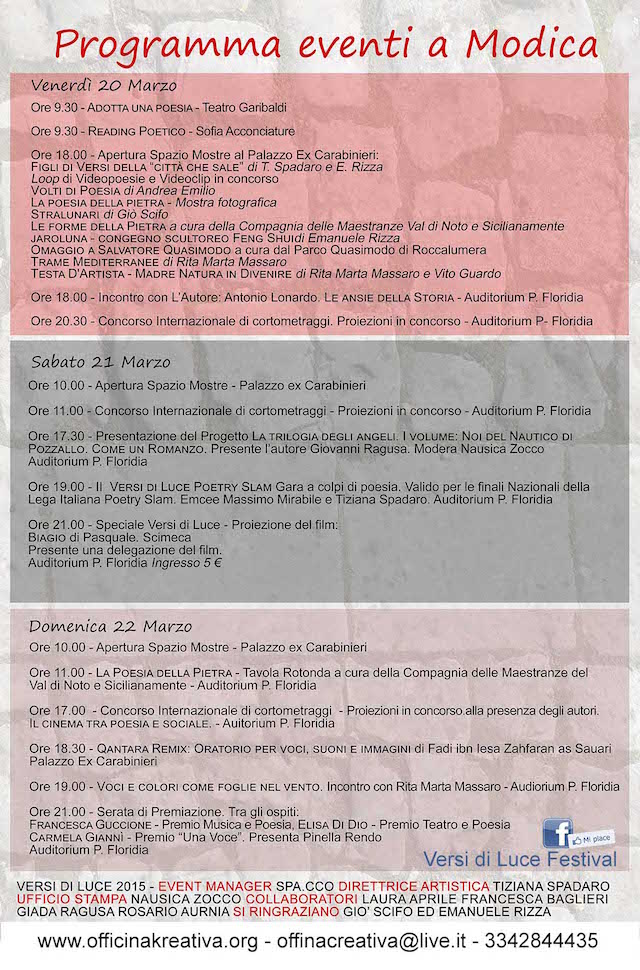Non a caso quest’anno gli elementi cardine della settima edizione sono racchiusi in parole come “masso”, “anima”, “sillabe silenziose”, tratte proprio dai versi del Poeta e seminate in ogni momento creativo e artistico che si vivrà durante la “tre giorni” in programma a Modica dal 20 al 22 marzo, in una location “allargata” dato che il Festival si snoderà tra il Teatro Garibaldi, l’Auditorium multimediale P. Floridia, il Palazzo ex Carabinieri, ecc.La Poesia, come la Parola, ha il potere eterno della pietra. Supera il tempo e lo spazio. Parla ai cuori, risveglia le menti, “legge” e incide gli animi. Tutto si può dire, tutto si può esprimere, tutto parla, evoca, provoca, coinvolge, unisce. “Versi di luce” percorre un “sentiero sensazionale” tracciato da Poesia e Cinema che sono due vasi comunicanti in armoniosa sinergia. Ci sono emozioni che non conoscono scorciatoie, non ne hanno bisogno. Tutti i filtri vengono annullati e si mostrano nudamente, sconvolgendo, stupendo, senza necessità di doversi spiegare per forza. Perché al Festival “Versi di luce” l’emozione passa.Il programma del Festival “Versi di luce 2015” prevede una “tre giorni” intensa: “Adotta una poesia” con gli Istituti scolastici della Provincia di Ragusa, Proiezioni dei video partecipanti al Concorso internazionale di cortometraggi “Versi di luce”, Reading poetici, Mostre fotografiche in tema, Incontri con autori e artisti, Presentazione di progetti culturali di ampio respiro, “Versi di luce Poetry Slam”, Proiezione del film “Biagio” del regista Pasquale Scimeca, Tavola rotonda “La poesia della pietra”, Iniziative artistiche collaterali, incontri culturali, rappresentazioni creative con artisti, ecc., fino ad arrivare alla Serata di Gala di domenica 22 marzo con la premiazione dei corti finalisti e delle menzioni speciali attribuite dalla giuria di esperti, la consegna dei tre premi “Musica e Poesia” all’artista Francesca Guccione, “Teatro e Poesia” alla regista e attrice Elisa Di Dio e “Una voce” alla giornalista Carmela Giannì, oltre a momenti di spettacolo inseriti nella programmazione della serata. “Versi di luce” quest’anno si svolgerà in parallelo anche a Gela dove una giuria popolare selezionerà e premierà i corti in Concorso che verranno premiati, anch’essi, nella Serata di Gala a Modica domenica 22 marzo. La settima edizione del Festival “Versi di luce” è conferma di prestigio e continuità: non un “fuoco nella paglia”. Grazie alla determinazione di quanti, a vario titolo, credono nel Progetto di “Officina Kreativa”, di cui “Versi di luce” è innesto riuscito.