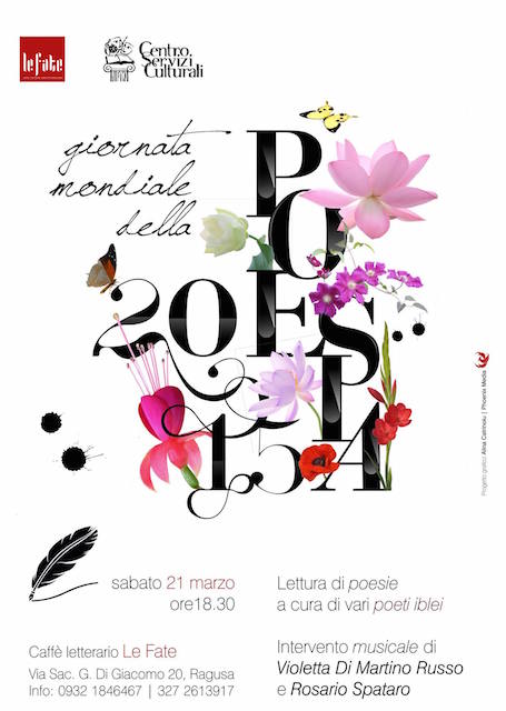 Ragusa, 21 marzo 2015 – A Ragusa, in occasione della Giornata Mondiale della Poesia, sabato 21 marzo alle ore 18:30, Le Fate (Via Sac. Di Giacomo 20, Ragusa) ospità alcuni tra i principali poeti dell'area iblea, tra cui Pippo Di Noto e Giovanna Vindigni.