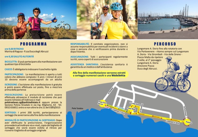 Sabato, pertanto, il Progetto Icaro 2015, nella splendida cornice del lungomare di Marina di Ragusa, chiuso al traffico per tutta la mattinata, vedrà la partecipazione dei bambini, dei genitori e di tutti i ragusani che vorranno partecipare, per dare, tutti insieme un forte segnale sull’uso della bici in sicurezza.