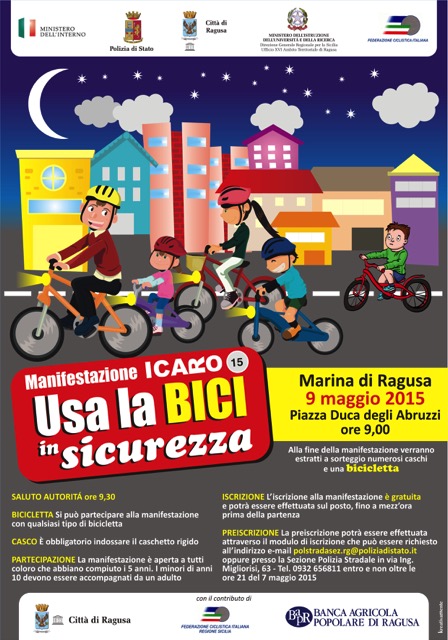 Ragusa, 7 maggio 2015 – Il progetto ICARO 2015, giunto alla XV Edizione, quest’anno diretto all’uso della bici in sicurezza, presentato lo scorso 21 gennaio presso il Comune di Ragusa, dalla Polizia Stradale, dopo aver completato il suo iter formativo nelle scuole della provincia, giunge al momento conclusivo nella manifestazione che si terrà a Marina di Ragusa, sabato 09 maggio, dalle ore 9.00 alle 13.00.