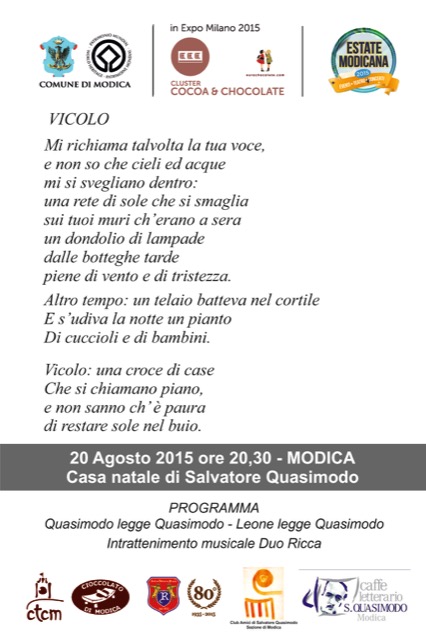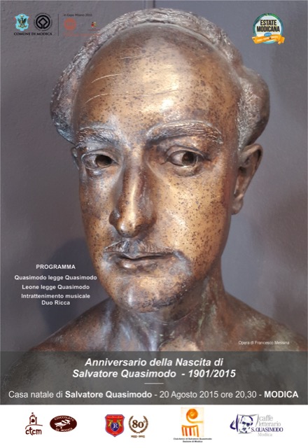 Modica, 15 agosto 2015 – Un appuntamento culturale per ricordare l’anniversario della nascita del Nobel per Letteratura Salvatore Quasimodo (1901- 2015), si terrà il prossimo 20 agosto, data di nascita del Nobel, davanti alla sua casa natale alle ore 20,30.