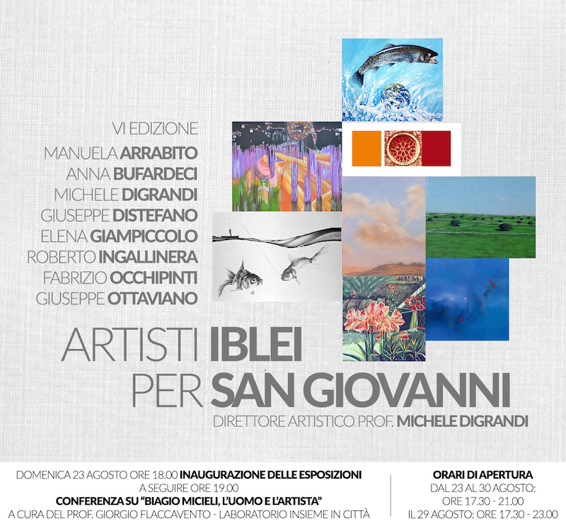 Ragusa, 19 agosto 2015 – Per il sesto anno consecutivo, all'interno degli eventi culturali della Festa di San Giovanni Battista, si terrà "Artisti iblei per San Giovanni" collettiva di pittura all'interno della quale espongono diversi pittori della nostra provincia. La mostra ha da sempre la direzione artistica del Prof. Michele Digrandi che, ogni anno, ha ricercato sul territorio numerose eccellenze artistiche ed anche alcuni giovani esordienti."Sembra che il tempo sia velocemente passato da quando nel 2010 l’amatissimo don Carmelo Tidona e lo scoppiettante, competente e molto entusiasta gruppo dei Giovani del comitato dei festeggiamenti, mi hanno affidato questo piacevole e, sotto certi versi, arduo e in qualche caso complicato compito", dice il prof. Michele Digrandi.