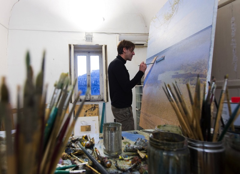 Ha scelto come linguaggi il disegno e la pittura, linguaggi antichi e che per lui sono ancora strumenti possibili di raccontare il reale. Le premesse sono nel suo desiderio di dipingere fin dall’infanzia, la sua frequentazione di una scuola di grafica a Urbino, l’Accademia a Roma, attratto dalle mostre della galleria Sperone, ma ancor di più attratto dalle opere dei musei romani; una fase questa di tentennamenti, di incertezze nella strada da intraprendere, se essere coinvolto dalle sperimentazioni di una certa avanguardia o rispondere in modo affermativo a ciò che lo coinvolgeva di più, e cioè la pittura dei musei.