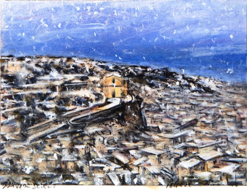 Presso il “Brancati”, inoltre, è aperta fino al 31 Gennaio (orario 17-20) la collettiva “CARTOLINE DA SCICLI”, 27 quadri di piccolo formato (cm. 18 X 13) che reinventano la visione di Scicli, regalando 27 affascinanti variazioni sul tema della cittadina barocca. Si parte dalle estrose invenzioni di Pinelli, Rinzivillo e Musso. Si continua con l’esuberanza primaverile di Barbante (“Barocco e fede”) e col gatto nel barocco di Mavie Cartia. Quindi la trasognata via Mormina Penna di Loredana Amenta e il San Bartolomeo visionario di Maria Guastella. Proseguiamo con “l’elegante preziosismo di Bracchitta, che alla monocromia del fondo azzurro accosta l’essenzialità d’un ramo in oro” (E. Mandarà). Poi la finissima “S. Maria la Nova” di Lissandrello, la Scicli immersa nel verde di Chessari, l’intenso notturno di D’Orazio. Candiano e Diara si dedicano a San Matteo, simbolo di Scicli. Giovanna Gennaro col d’après “Amore e guerra” rimanda finemente alla drammaticità dei nostri tempi. Polizzi rende immortale “la nevicata del 2014” (Mimì non c’entra…). Leopardiane “Le geometrie del cielo e del mare” di Sarnari. Esplodono i colori in Zuccaro (“Palazzo Spadaro”) e in Sacco (“Un pensiero cromatico da Scicli”). Ha una levità vermeeriana il mare di Colombo; sembra affiorare dalle acque la S. Bartolomeo di Ilde Barone; ben altre atmosfere spuntano in Di Quattro (“Paesaggio di Scicli”). Robustelli evidenzia espressionisticamente l’espressionismo dei mori del Beneventano, mentre Puglisi evidenzia la “luce e lutto” del S. Luigi della chiesa Madre. E Alessandra Scifo si sofferma su un puttino della stessa chiesa, dirimpetto alla quale si trova il palazzo Fava che la Rampanti anima col volo di una colomba. Salvo Barone e Messina si dedicano ai “Mulici”: il primo ai mori, il secondo alla statua della surreale Madonna a cavallo.