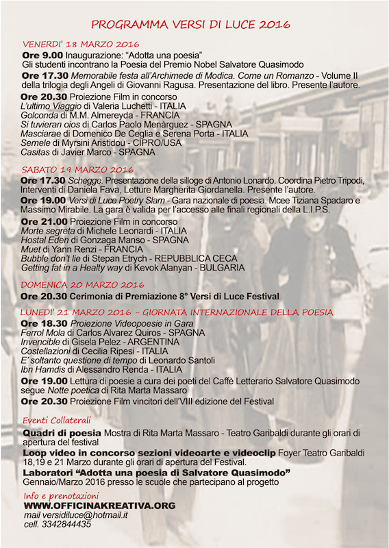 #Modica, 15 marzo 2016 – Al via anche quest’anno l’evento “Versi di Luce”, Festival di Cinema e Poesia in programma a Modica dal 18 al 21 marzo 2016, organizzato da “Elpis” Soc. Coop., in collaborazione con il “Club Amici di Salvatore Quasimodo”, Cineteca Modicana e “CineClub 262”. “Versi di luce” conferma la sua unicità, sottolineata dal fatto che la manifestazione, per quest’anno, avrà la durata di ben quattro giorni, scelta motivata dal notevole interesse suscitato a livello sociale e dalla risonanza positiva riscontrata nelle edizioni precedenti e dai numerosi contributi culturali raccolti nell’organizzazione dell’evento, ricevendo, per l'ottava volta consecutiva, la concessione del patrocinio da parte della C.N.I. per l’Unesco, a riprova della validità di quanto proposto e nello spirito di vivere l’evento in oggetto come una vera e propria missione culturale rivolta alla sensibilità di coscienze desiderose di espressione e di comunicazione emozionale.