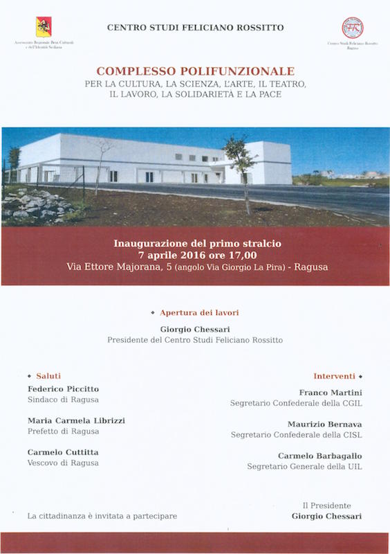 Ragusa, 6 aprile 2016 – Il Centro Studi Feliciano Rossitto invita all’inaugurazione del primo stralcio del Complesso Polifunzionale per la cultura, la scienza, l’arte, il teatro, il lavoro, la solidarietà e la pace che si terrà giovedì 7 aprile 2016, ore 17 nei nuovi locali di Via Ettore Majorana 5 (angolo Via Giorgio La Pira), a Ragusa.