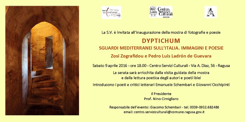 Le immagini di Zosi Zografidou e Pedro Luis Ladrón de Guevara nella loro nuova veste del Dyptichum iniziano il loro viaggio per il Mediterraneo da Atene (gennaio-febbraio 2015) dove vengono presentate dall’Istituto Italiano di Cultura in Grecia in collaborazione con la casa editrice Aracne di Roma che ha pubblicato i cataloghi della mostra.