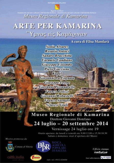 Ragusa, 5 luglio 2014 – Quattordici artisti d'eccezione, chiamati a dare il loro omaggio ad un tempio sacro di bellezza e storia del territorio ibleo, Kamarina. Ideato e curato dal critico d’arte Elisa Mandarà, prende vita “Arte per Kamarina, ʽΎμνος εἰς Καμάριναν”, uno straordinario progetto, una mostra d'arte che unisce alcune delle voci più significative iblee contemporanee, artisti di fama nazionale ed internazionale, in un sito già carico di suggestioni storiche: Sonia Alvarez, Rosario Antoci, Sandro Bracchitta, Carmelo Candiano, Giuseppe Colombo, Piero Guccione, Kapel (nome d’arte del maestro Emanuele Cappello), Giovanni La Cognata, Giuseppe Leone, Giovanni Lissandrello, Franco Polizzi, Giovanni Robustelli, Franco Sarnari, Velasco Vitali.