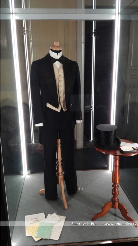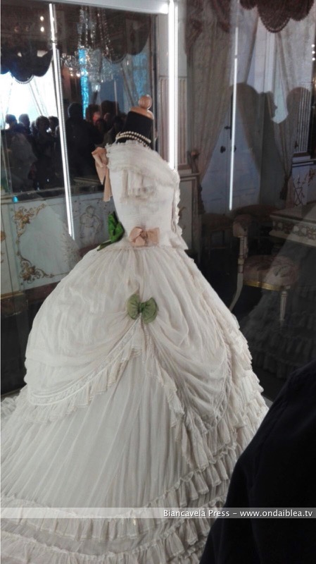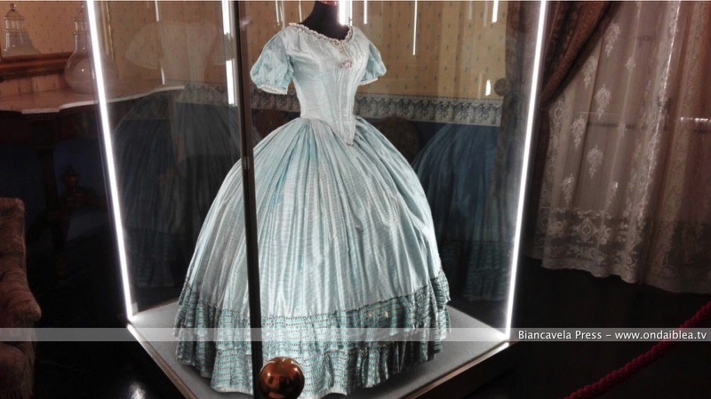Contribuisce ad arricchire la “Galleria del Costume”, l’abito che ispirò quello di Angelica nel “Gattopardo”. È un abito da ballo in organza avorio, a righini lucidi, montato su base di seta verde chiarissimo. Tutte le decorazioni concedono all’abito una maestosità che lo ha reso noto in tutto il mondo per la scena del ballo di Angelica.
