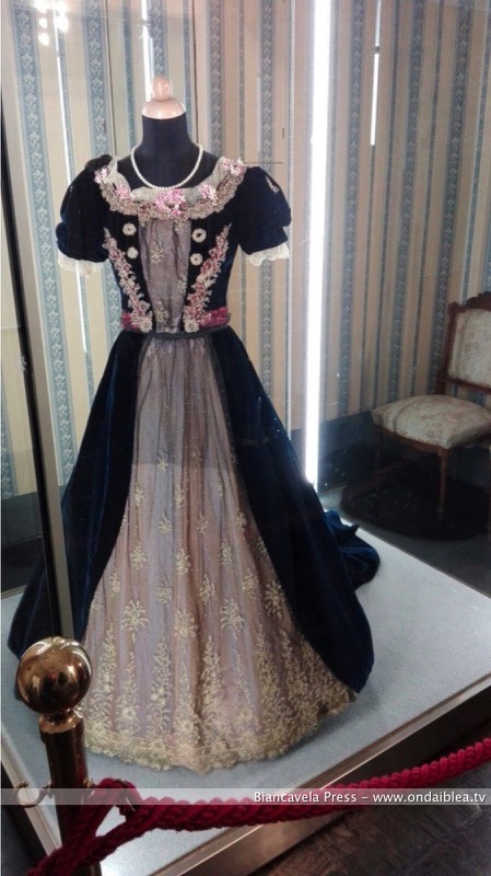 Con la leggenda di Bianca di Navarra prosegue il filone romantico e leggendario parlando di un altro abito. Si tratta di un vestiario femminile definito “Abito per il pomeriggio”, che si trova nella “Sala degli specchi”. È un abito bianco puro, a maniche corte, a balze, arricchito da fiocchi beige e verdi sparsi qua e là per tutta la sua superficie, e una gonna dal diametro di quattro metri e mezzo. Il bianco dell’abito risplende e abbraccia tutto il salone, la cui immagine si riflette rimbalzando da uno specchio all’altro.