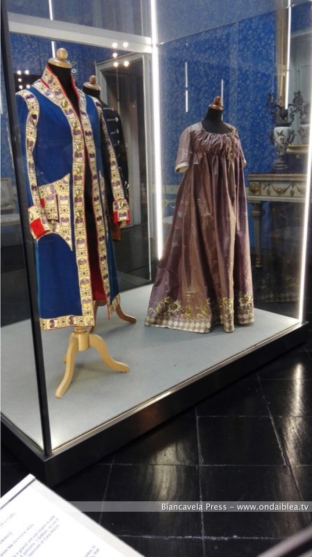 Il visitatore ha l’opportunità di passeggiare tra i saloni del “castello” e ammirare la bellezza degli abiti in cui storia, arte e moda si intrecciano in un connubio perfetto. Il piano che accoglie la “Galleria del Costume” è il piano principale, ovvero il piano nobiliare dove è possibile apprezzare un susseguirsi di saloni e stanze, che, in occasione della mostra, ravvivano la già suggestiva atmosfera che si respira tra gli arredi. La “Sala d’attesa” (ovvero il primo ambiente in cui entra il visitatore, luminoso salone con grandi quadri di inizio Ottocento) ospita due abiti, uno maschile e uno femminile. Risalta agli occhi il blu intenso della veste maschile col giallo oro dei bottoni gioiello, intarsiati dalle iniziali C. A. (Casato Arezzo).