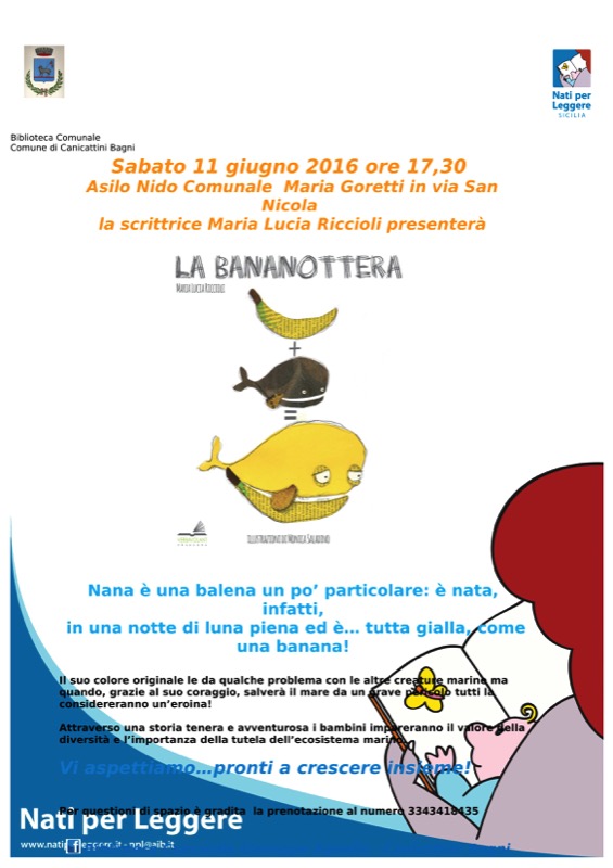 Biblioteca comunale “G. Agnello” - Nati per Leggere: “La Bananottera”, Incontro con la scrittrice Maria Lucia Riccioli - Sabato 11 Giugno 2016 ore 17,30 Asilo Nido comunale “S. Maria Goretti” via San Nicola, Canicattini Bagni