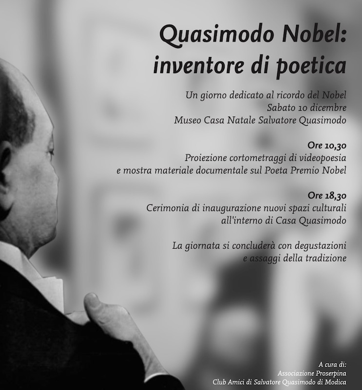 Già, perché il 10 dicembre 2016, nella ricorrenza dei 57 anni dall’assegnazione del Nobel per la Letteratura a Quasimodo, Modica vivrà un appuntamento unico e mai realizzato prima a Casa Quasimodo: una giornata per celebrare il Poeta, unendo gli intenti di due associazioni modicane: l’Associazione “Proserpina” e il “Club Amici di Salvatore Quasimodo”.