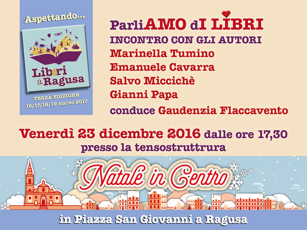 Ragusa, 23 dicembre 2016 – Libri per Natale, libri per tutto l'anno... Hanno parlato di libri, per iniziativa del Comune di Ragusa, Ragusa in Centro, nella tecnostruttura di Piazza San Giovanni, gli autori Marinella Tumino, Emanuele Cavarra, Salvo Micciché e Gianni Papa. Ha moderato la prof. Gaudenzia Flaccavento.