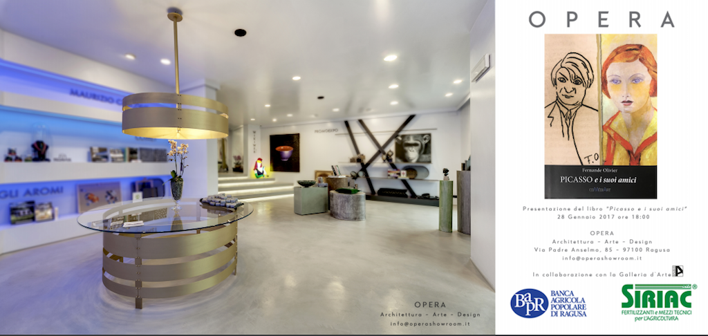 Ragusa, 25 gennaio 2017 – Il prossimo 28 gennaio, all'interno dello showroom di “Opera” a Ragusa, si terrà la prima presentazione in Italia del libro “Picasso e i suoi amici” di Fernande Olivier nell'edizione CoMédiArt (2016), Francia. Fernande Olivier è stata compagna di Pablo Picasso durante i primi anni dell'artista a Parigi, e testimone dei rapporti intimi e quotidiani fra l'artista e personalità straordinarie della cultura parigina dei primi del Novecento. Quella riportata nel libro è una testimonianza unica, memoria intima e preziosa, che racconta le suggestioni di un epoca fantastica per la cultura e l'arte mondiale. La relazione tra Fernande Olivier e Picasso durò sette anni, vent'anni dopo scrisse l'ex modella francese scrisse un libro sulla storia avuta con l'artista spagnolo. Il libro, intitolato Picasso e i suoi amici, fu pubblicato inizialmente a puntate nel 1930 nonostante l'opposizione dello stesso Pablo Picasso che ingagIò anche dei legali, ma senza riuscire nell'intento di fermare la pubblicazione dell'opera.