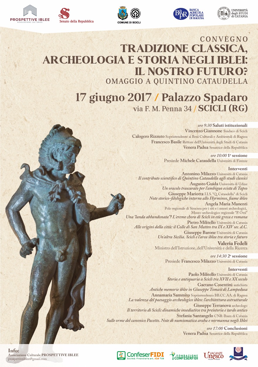 Scicli, 14 giugno 2017 – “Tradizione classica, archeologia e storia negli Iblei: il nostro futuro?": questo il titolo dell'evento culturale che si terrà a Scicli sabato 17 giugno presso Palazzo Spadaro. L'importante giornata di studio e di confronto interdisciplinare è organizzata dall'associazione culturale Prospettive Iblee, con l'alto patrocinio del Senato della Repubblica e con quello dell'Università degli Studi di Catania, del Comune di Scicli e della Banca Agricola Popolare di Ragusa.