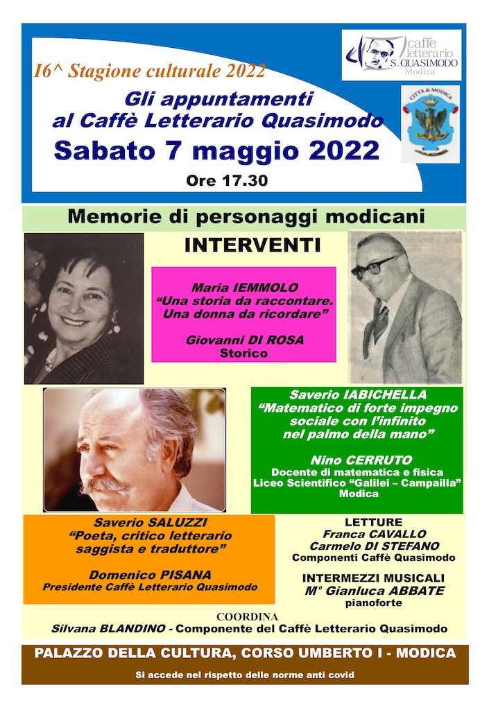 A Modica, al Caffè Quasimodo (Palazzo della Cultura) «Memorie di personaggi modicani: Maria Iemmolo, Saverio Iabichella e Saverio Saluzzi»