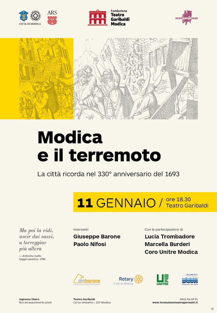 Ricordo e ricostruzione storica del terremoto che 1693 colpì disastrosamente il Val di Noto e tutto il Sudest. La ricostruzione e la nascita delle città moderne. A Modica ne parleranno gli storici Giuseppe Barone e Paolo Nifosì, con Marcella Burderi, Lucia Trombadore, al Garibaldi