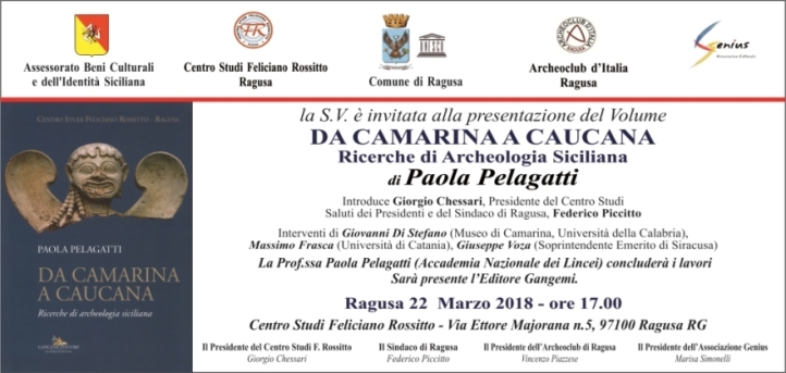 Ragusa, 19 marzo 2018 – Giovedì 22 marzo 2018, alle ore 17.00, presso il Centro Studi Feliciano Rossitto di Ragusa (via Ettore Majorana 5), presentazione del volume “Da Camarina a Caucana. Ricerche di archeologia siciliana”, di Paola Pelagatti, pubblicato per i tipi di Gangemi editore.