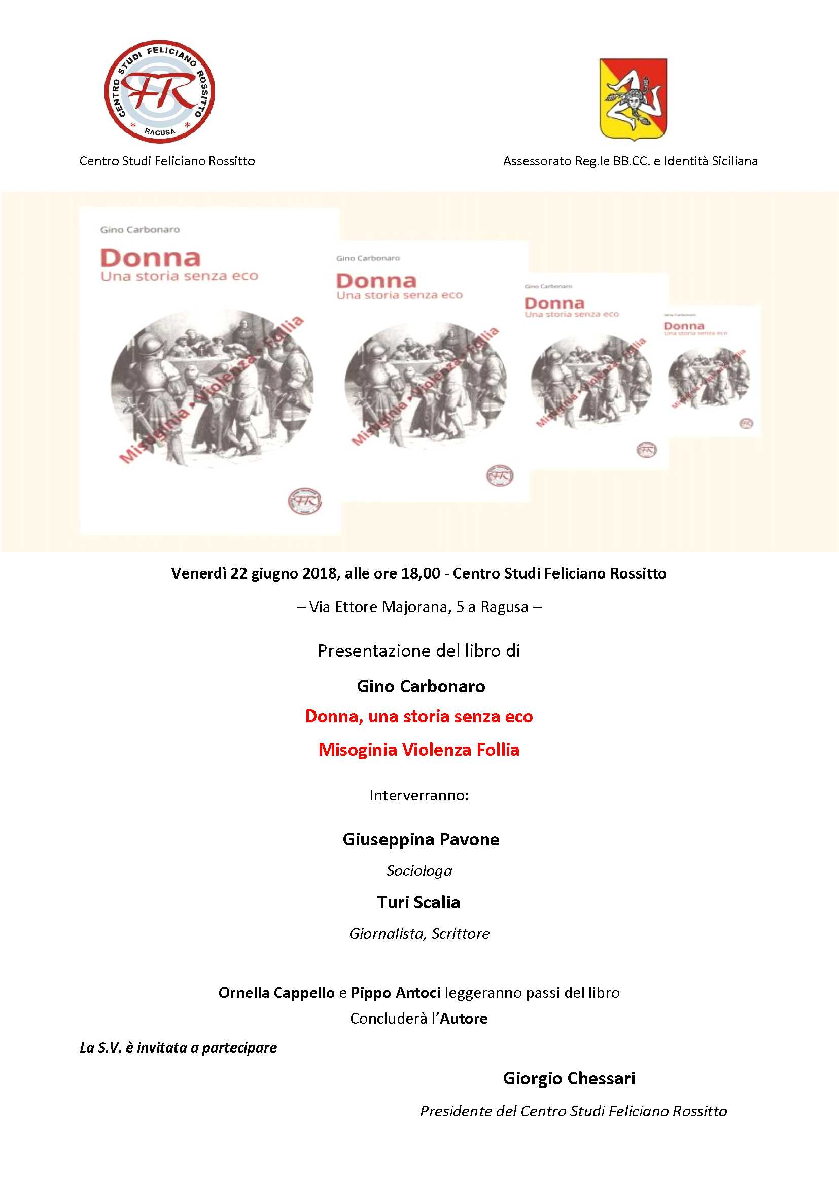 Il Centro Studi “Feliciano Rossitto” di Ragusa fa sapere che venerdì 22 giugno 2018, alle ore 18.00, presso la propria sala conferenze (Via Ettore Majorana, 5) sarà presentato il libro di Gino Carbonaro, “Donna, una storia senza eco - Misoginia Violenza Follia”.