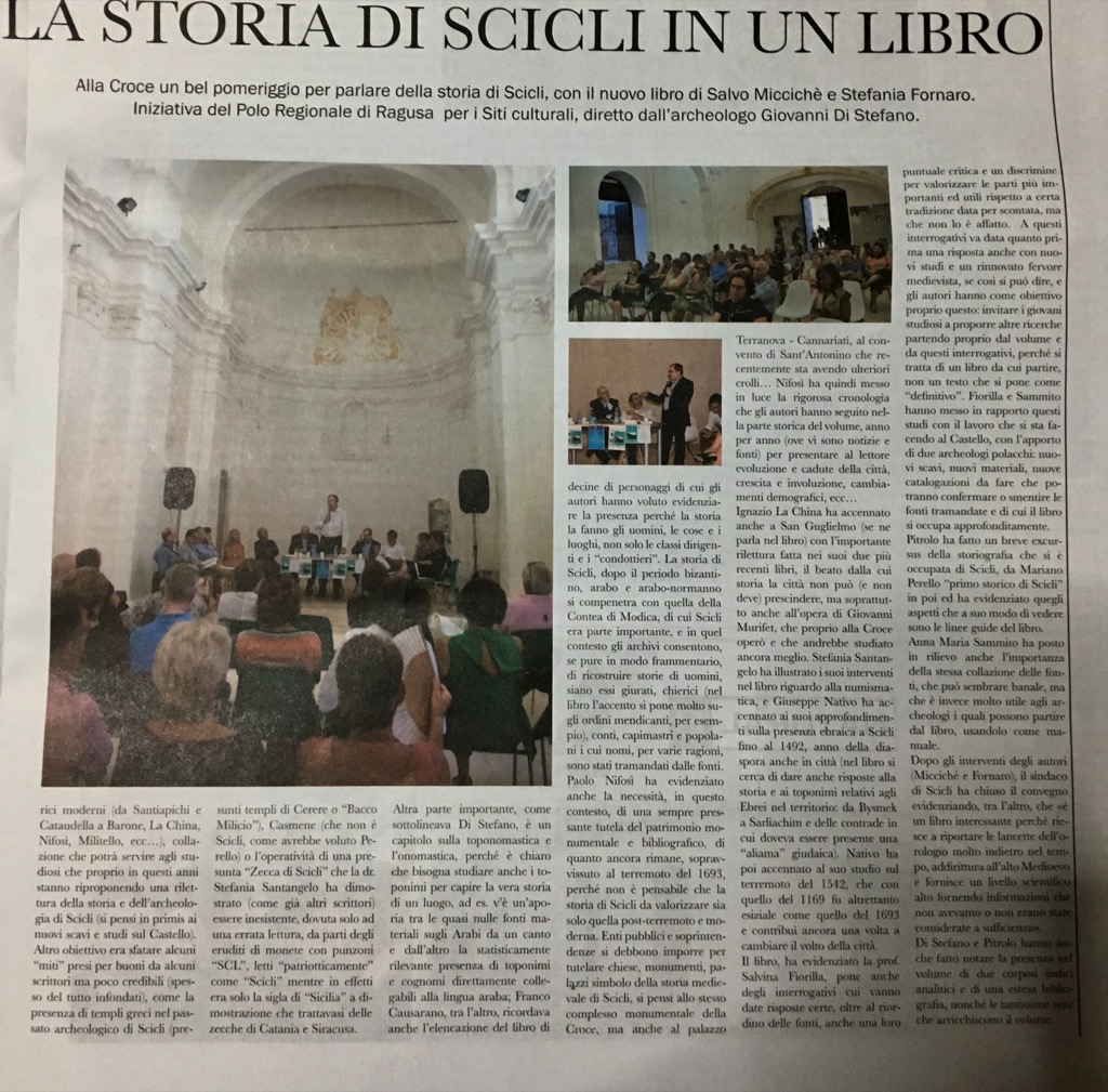 Il Giornale di Scicli (n. 13 del 30 settembre 2018) ha pubblicato alle pp. 6 e 7 la recensione (“La storia di Scicli in un libro”), a firma di Concetta Ferma, della conferenza di presentazione del libro di Salvo Micciché e Stefania Fornaro, Scicli. Storia, cultura e religione (secc. V-XVI), Carocci Editore (2018, pp. 404).