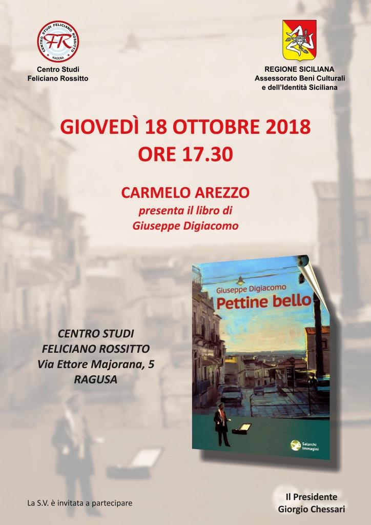 Ragusa, 10 settembre 2018 – Giovedì 18 ottobre 2018, alle ore 17:30, presso il Centro Studi “Feliciano Rossitto” (Via Ettore Majorana 5, Ragusa), il critico letterario Carmelo Arezzo presenterà il libro di Giuseppe Digiacomo, Pettine bello (Salarchi Immagini).