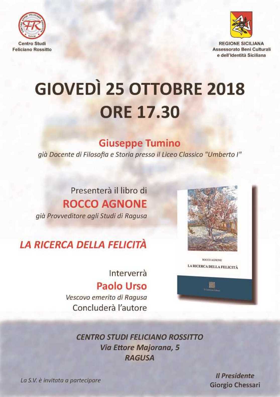 Ragusa, 20 ottobre 2019 – Giovedì 25 ottobre 2018 alle ore 17.30 presso il Centro Studi “Feliciano Rossitto” (Via Ettore Majorana 5, Ragusa) il prof. Giuseppe Tumino (già docente di Storia e Filosofia presso il Liceo Classico Umberto I di Ragusa) presenterà il libro di Rocco Agnone, “La ricerca della felicità”. È previsto l’intervento di mons. Paolo Urso (vescovo emerito di Ragusa).