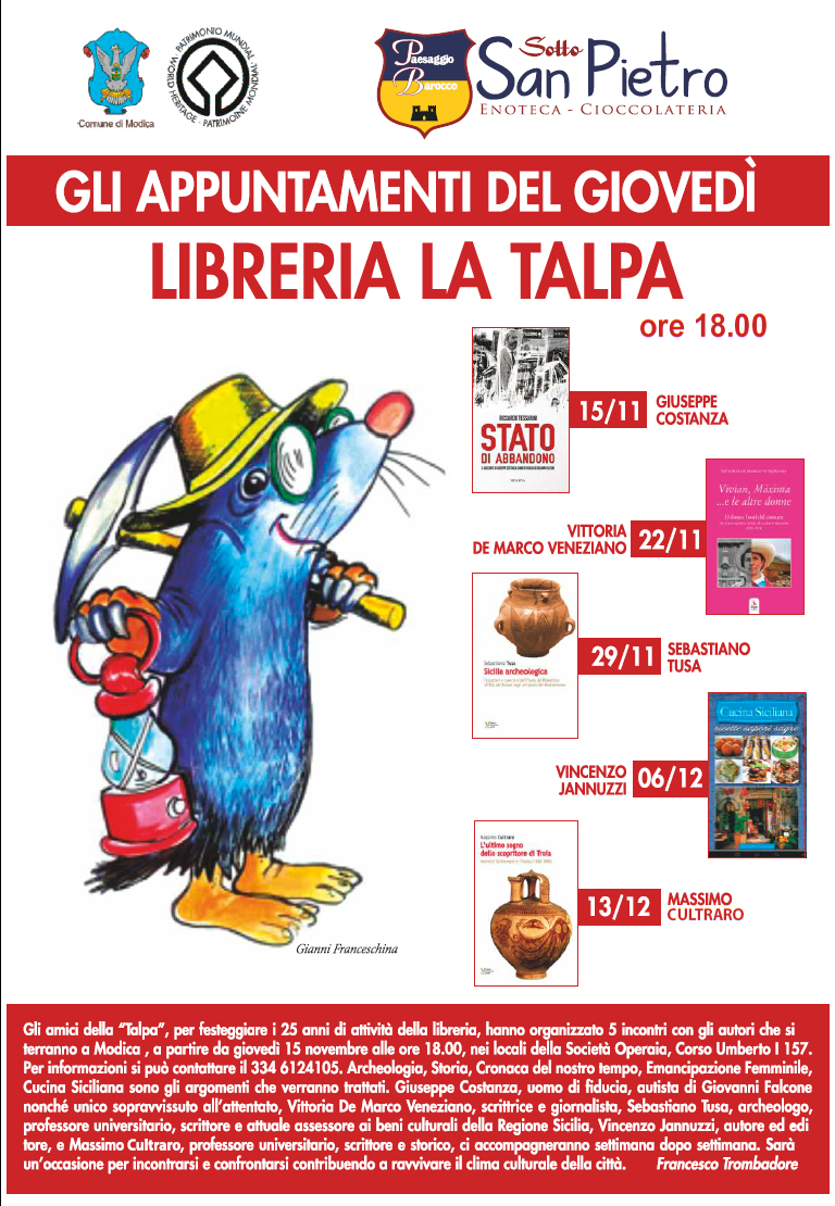 Modica, 26 novembre 2018 – Col patrocinio del Comune di Modica, la Libreria "La Talpa" in occasione del suo venticinquesimo anno di attività organizza un ciclo di cinque "Appuntamenti del Giovedì" che si terranno a Modica presso i locali della Società Operaia di Mutuo Soccorso in Corso Umberto I° n. 157. Giuseppe Costanza, Vittoria de Marco Veneziano, Sebastiano Tusa, Vincenzo Jannuzzi e Massimo Cultraro saranno i protagonisti di questo ciclo di appuntamenti che spazieranno tra la cronaca del nostro tempo, le donne che hanno fatto la storia, l'archeologia e le tradizioni siciliane.