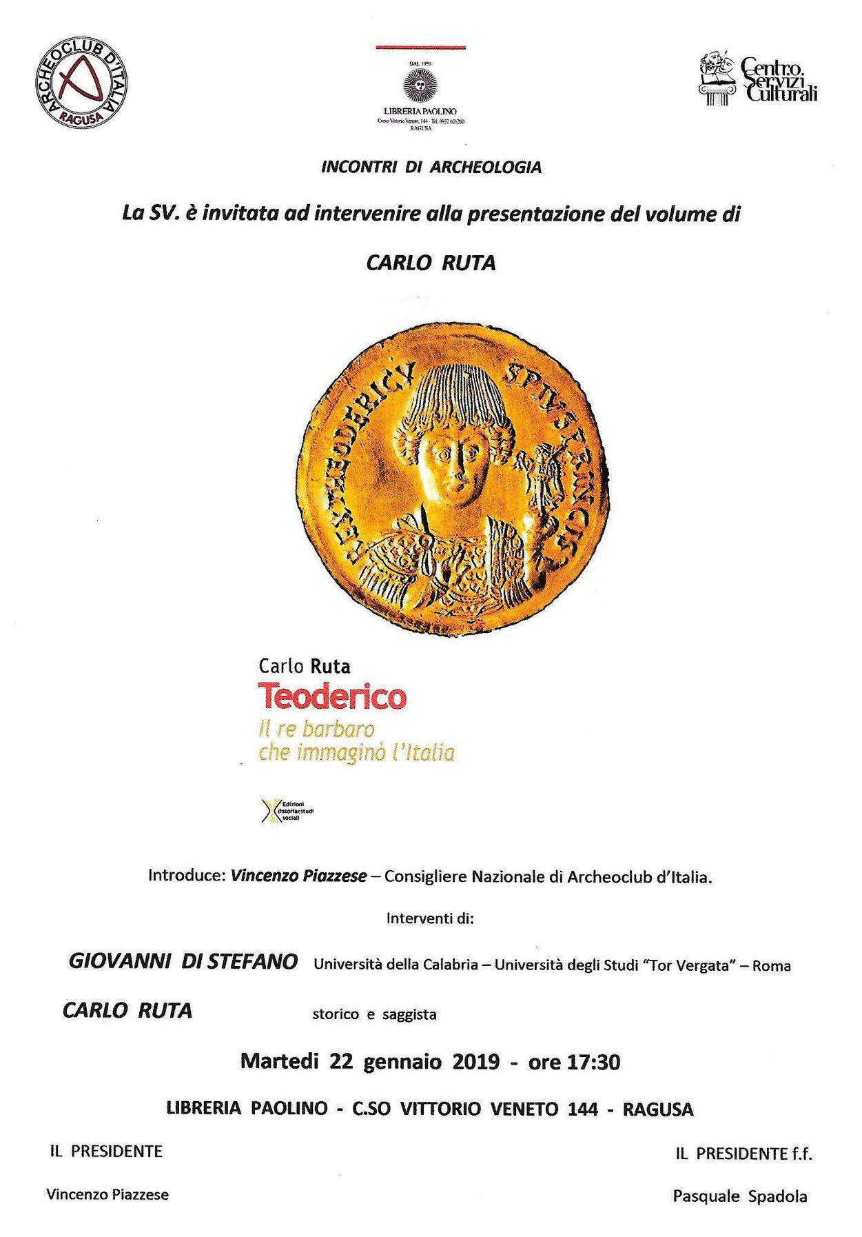 Ragusa, 14 gennaio 2019 – Il libro di Carlo Ruta "Teoderico - il re barbaro che immaginò l'Italia" (Edizioni di Storia e studi sociali) sarà presentato a Ragusa il 22 gennaio 2019 (ore 17:30), presso la Libreria Paolino (Corso Vittorio Veneto 144).
