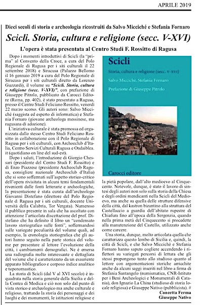 Gli autori della recensione hanno sottolineato anche la recente presentazione a Ragusa, presso il Centro Studi Feliciano Rossitto, a cura dello stesso centro, del Polo Regionale di Ragusa per i siti culturali, di Archeoclub e di CSC (Centro Servizi Culturali Emanuele Schembari), con la collaborazione della nostra rivista, Ondaiblea.