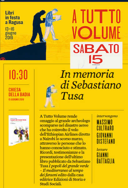 Ragusa, 12 giugno 2019 – Nell’ambito della manifestazione “A tutto volume” è previsto un omaggio alla grande figura del compianto archeologo Sebastiano Tusa, scomparso nel disastro dell’Ethiopian Airlines a marzo.