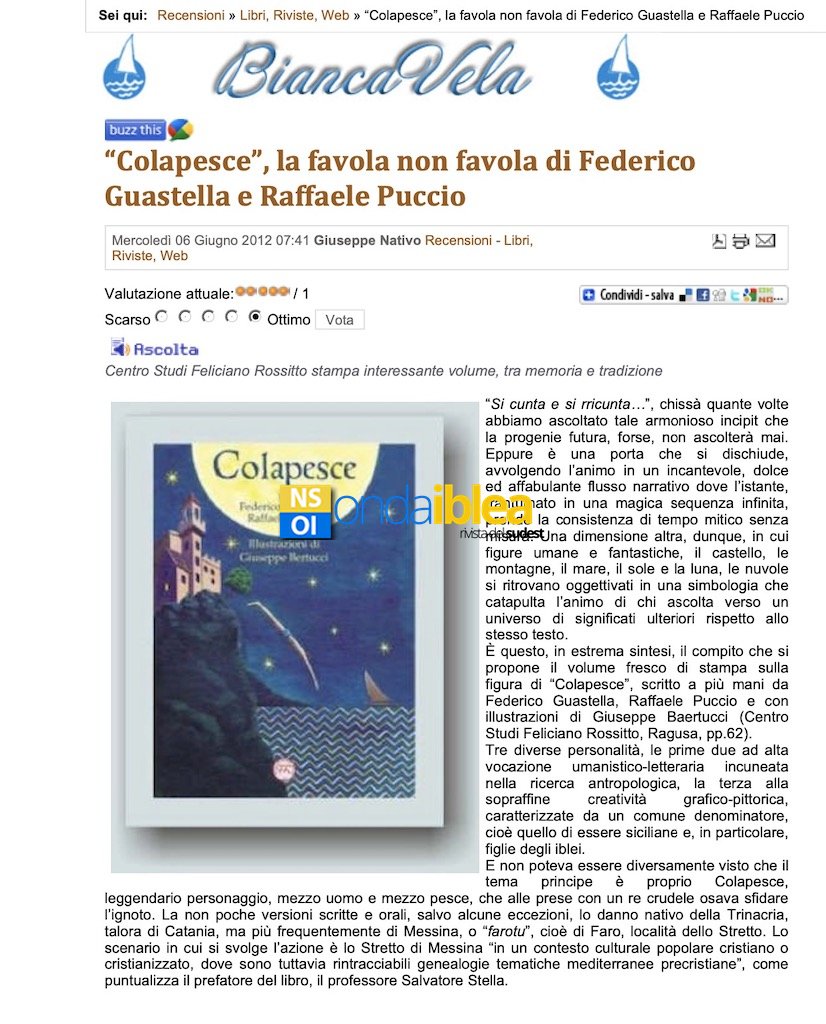 Nel racconto proposto e rivisitato dagli autori la figura di Colapesce, «ca sapia natari megghiu d’un pisci», apre un ampio ventaglio di riflessioni tanto sul piano mitico quanto su quello filologico e nasce in quell’humus storico che caratterizza la cultura europea medievale conservandosi pressoché invariata fino a tempi recenti. Proprio perché le radici affondano in tempi antichissimi, Colapesce è un personaggio conosciuto da tutti. Ed è per questo motivo che il Colapesce di Federico Guastella e Raffaele Puccio è un libro per tutti e, in particolare, per i piccoli che lo devono leggere ai grandi in quanto Colapesce è una favola non favola e tenendo presente, come specificato in quarta di copertina, che «non tutte le favole sono solamente favole».