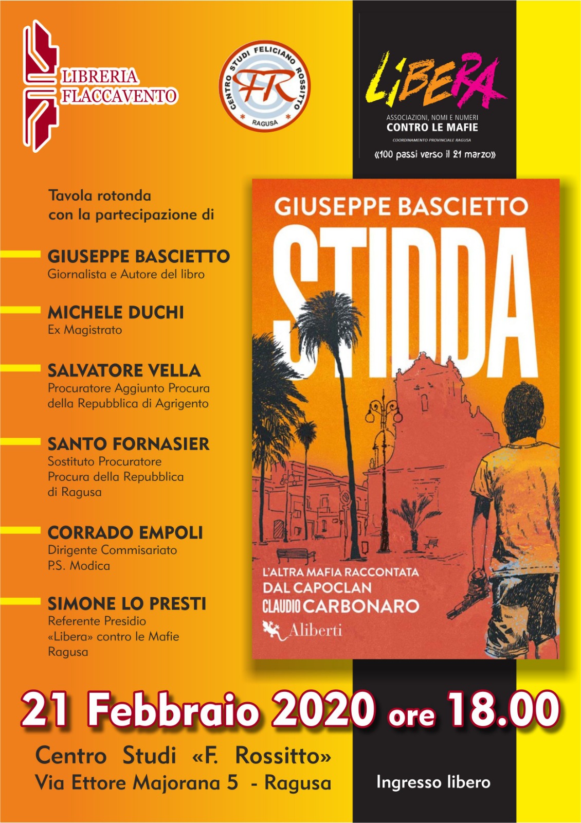 Ragusa, 12 febbraio 2020 – Venerdì 21 febbraio 2020, alle ore 18.00, presso il Centro Studi Feliciano Rossitto (Via Ettore Majorana 5, Ragusa) si terrà la Tavola rotonda sul libro di Giuseppe Bascietto “Stidda. L'altra mafia raccontata dal capoclan Claudio Carbonaro” (Compagnia Editoriale Aliberti, 2019).