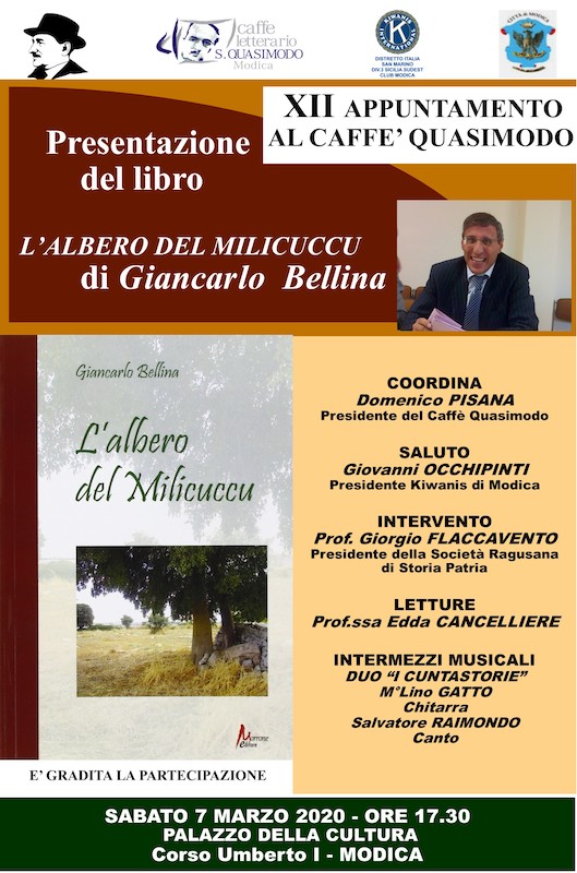 Modica, 1 marzo 2020 – “L’albero del milicuccu”: è questo il titolo del libro di Giancarlo Bellina, che sarà presentato nel XII appuntamento del Caffè Letterario Quasimodo di Modica, dedicato alla memoria storica e alla tradizioni, e in programma alle ore 17,30 al Palazzo della Cultura il prossimo 7 marzo, nel quadro della Stagione culturale 2019-2020 del circolo culturale modicano.
