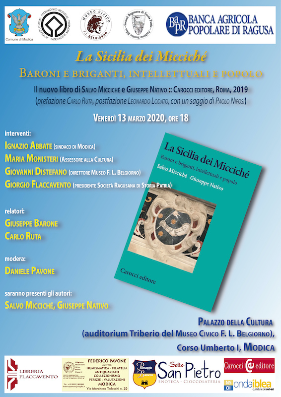 Ragusa, 2 marzo 2020 – Dopo l'incontro con i lettori a Ragusa (il 12 dicembre 2019) e l'entusiasmante presentazione a Scicli (il 15 febbraio 2020) con la presenza di un folto e colto pubblico entusiasta, il volume di Salvo Micciché e Giuseppe Nativo, La Sicilia dei Micciché, Carocci Editore, sarà presentato a Santa Croce Camerina e Modica.