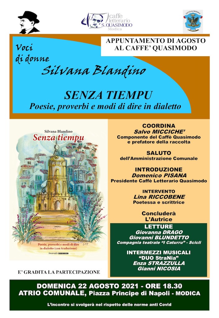 Modica, 12 agosto 2021 — “Senza tiempu. Poesie, proverbi e modi di dire in dialetto”: è il titolo del nuovo libro di Silvana Blandino, poetessa del Caffè Quasimodo di Modica, che sarà presentato nell’appuntamento letterario che si terrà alle ore 18.30 nell’Atrio Comunale di Modica domenica 22 agosto alle ore 18:30, nel quadro delle iniziative del circolo culturale modicano.