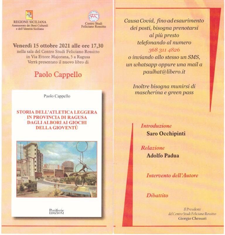 Ragusa, 13 ottobre 2021 — Il presidente del Centro Studi “Feliciano Rossitto” rende noto che venerdì 15 ottobre 2021, alle ore 17,30, nella sala dello stesso Centro (Via Ettore Majorana 5, Ragusa) sarà presentato il libro di Paolo Cappello dal titolo “Storia dell’atletica leggera in provincia di Ragusa dagli albori ai giochi della gioventù”.