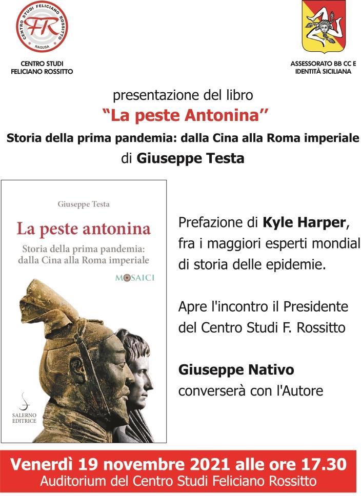 Ragusa, 15 novembre 2021 — Serata all’insegna della storia al Centro Studi “Feliciano Rossitto”. Venerdì 19 novembre 2021, alle ore 17,30, nella sala dello stesso Centro (in Via Ettore Majorana 5, Ragusa) sarà presentato il libro del giornalista Giuseppe Testa, “La peste antonina. Storia della prima pandemia: dalla Cina alla Roma imperiale” (Salerno Editrice, Roma, 2021, pp. 236), con prefazione di Kyle Harper, fra i maggiori esperti mondiali di storia delle epidemie.