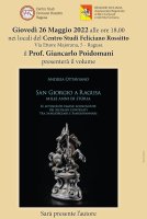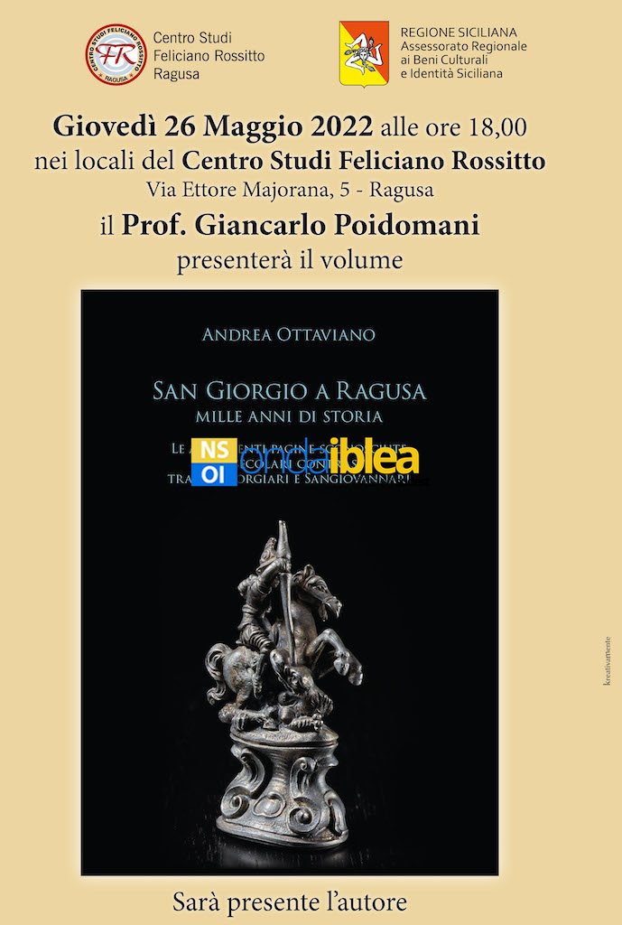 Ragusa, 21 maggio 2022 — Giovedì 26 maggio, alle ore 18.00, nei locali del Centro Studi Feliciano Rossitto (Via Ettore Majorana 5, Ragusa), il prof. Giancarlo Poidomani presenterà il volume di Andrea Ottaviano dal titolo “San Giorgio a Ragusa. Mille anni di storia. Le avvincenti pagine sconosciute dei secolari contrasti tra sangiorgiari e sangiovannari” (2022).