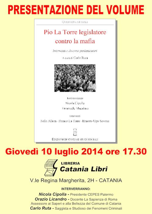 Giovedì 10 luglio 2014, alle ore 17,30, presso la libreria Catania Libri, viale Regina Margherita, 2/H Catania, presentazione del libro Pio La Torre legislatore contro la mafia, edito da Edizioni di storia e studi sociali. Ne parlano: Nicola Cipolla, compagno di lotte di Pio La Torre nella Sicilia del feudo e già senatore della Repubblica del Partito Comunista Italiano; Orazio Licandro, docente ordinario di Diritto romano all’Università La Sapienza di Roma e assessore ai Saperi e alla Bellezza del comune di Catania; Carlo Ruta, saggista e studioso dei fenomeni criminali.